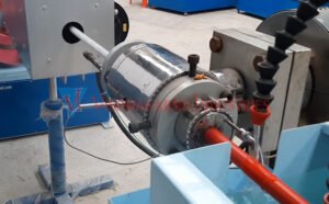 The hot, shaped pipe is passed through a stainless-steel water-cooling tank to solidify and retain its dimensions. Proper cooling prevents pipe deformation and improves flexibility. The cooling system is equipped with water sprayers and a recirculating pump for efficient thermal management.